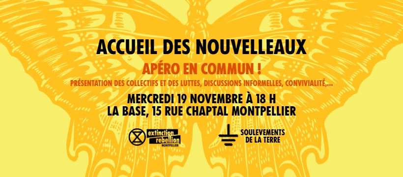 Réunion d'accueil en commun, organisée par Extinction Rebellion Montpellier et le comité local des Soulèvements De La Terre Montpellier