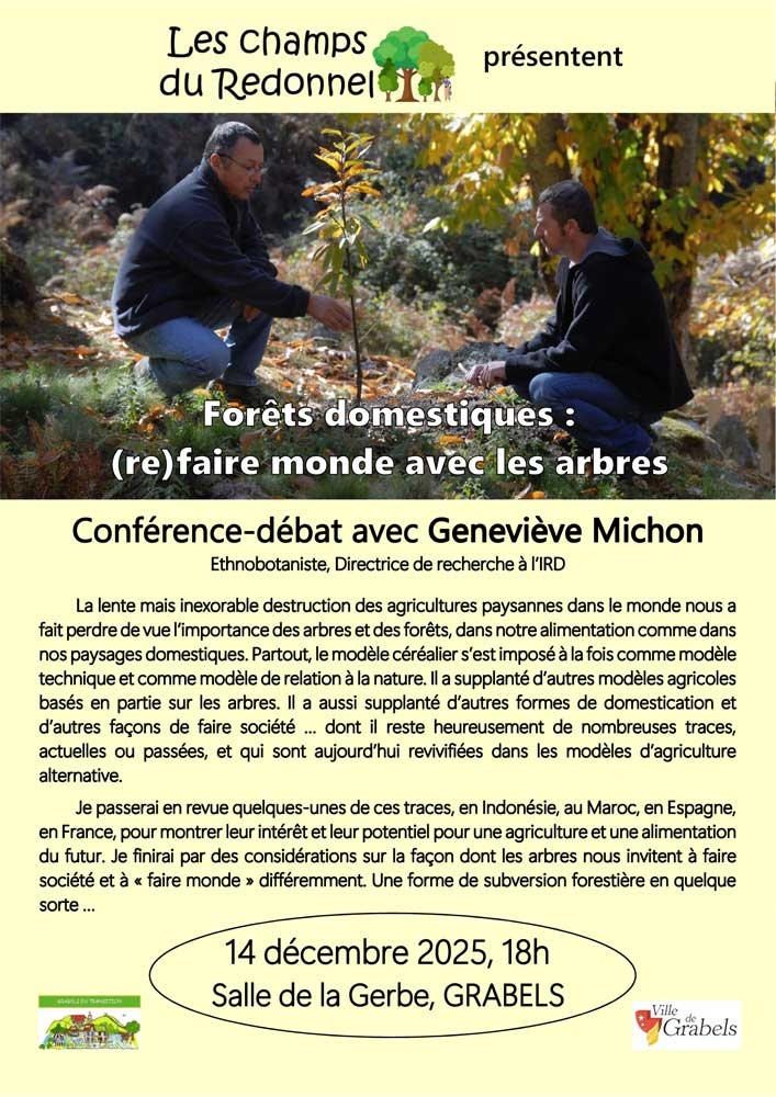 L'association Les champs du Redonnel vous invite à l'exposition Arbres mémoire, arbres du futur, magnifiques photos d'arbres de Geneviève Michon du 9 au 14 décembre à la Salle de la Gerbe à Grabels. Cette semaine se conclura par sa conférence, Forêts domestiques, (re)faire monde avec les arbres le dimanche 14 décembre à 18h. Nous aurons ensuite l'occasion d'échanger avec elle autour d'un apéro-soupe.