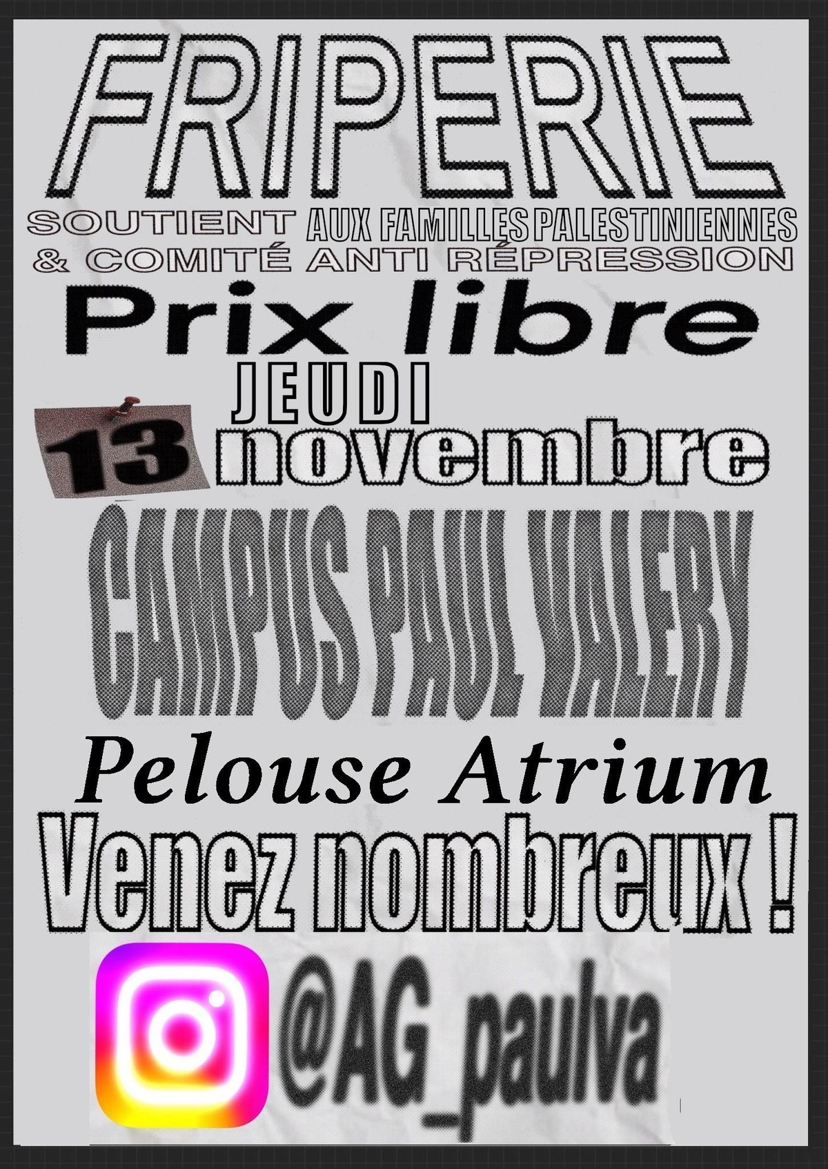 Friperie solidaire à prix libres, tout l'argent récolté sera reversé à l'antirep Montpellier et à Terra Solidaire (association de soutien aux familles palestiniennes). De 10h30 à 17h, sur la pelouse de Paul Valéry. N'hésitez pas à ramenez des vêtements que vous ne portez plus ! :)