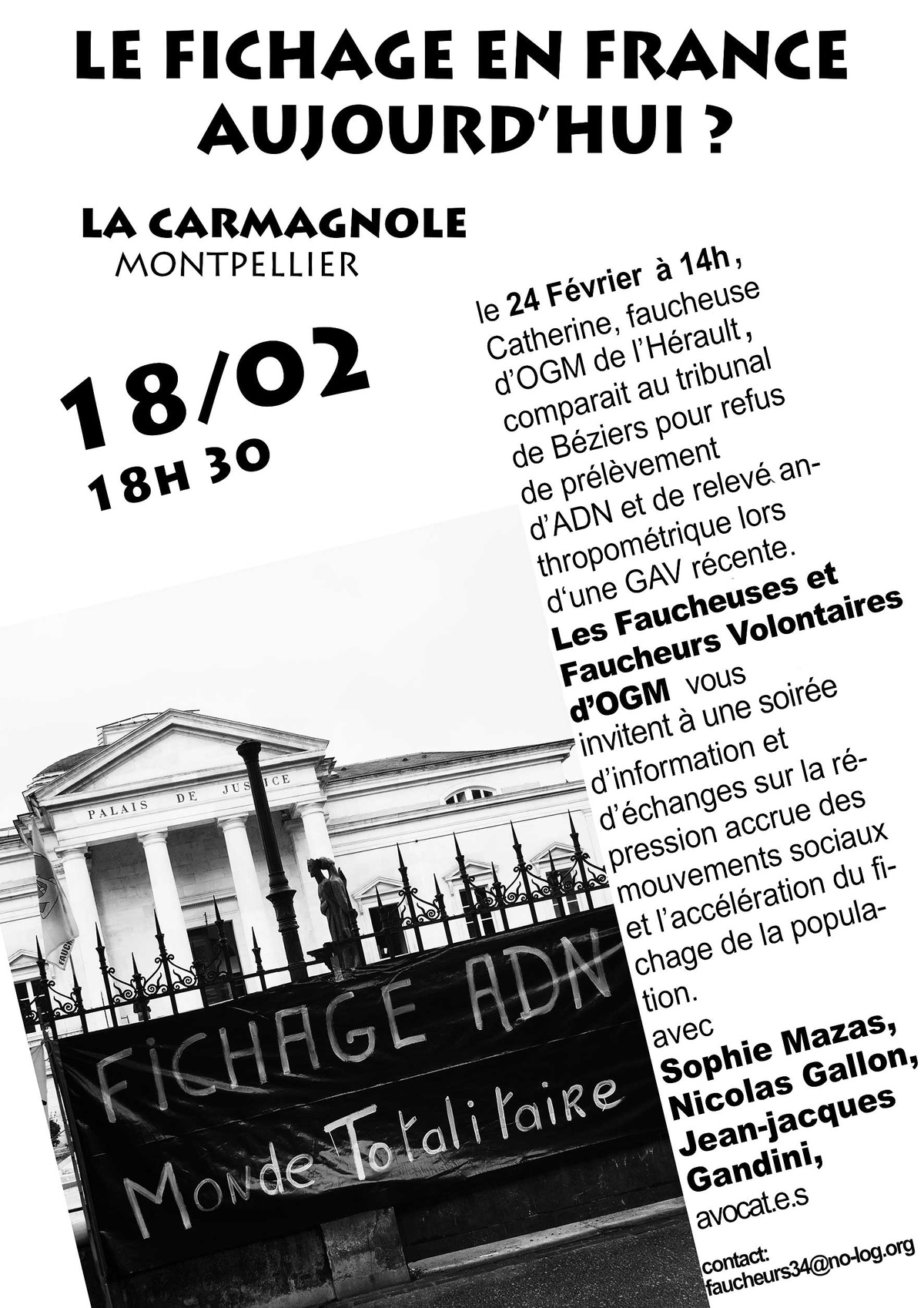 Alors qu'une de nos camarades faucheuse volontaire d'OGM passe à nouveau en procès pour refus de prélèvement d'ADN et relevé anthropométrique au tribunal de Béziers le mardi 24 février prochain, les faucheuses et faucheurs volontaires d'OGM de l'Hérault vous invitent à une soirée d'information et d'échanges sur la répression accrue des mouvements sociaux et l'accélération du fichage de la population.