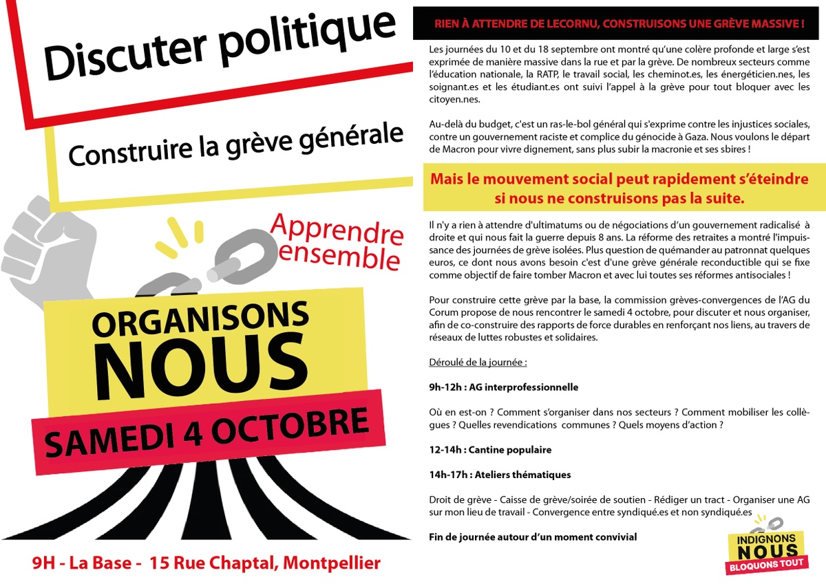 Pour construire cette grève par la base, la commission grèves-convergences de l’AG du Corum propose de nous rencontrer le samedi 4 octobre, pour discuter et nous organiser, afin de co-construire des rapports de force durables en renforçant nos liens, au travers de réseaux de luttes robustes et solidaires.