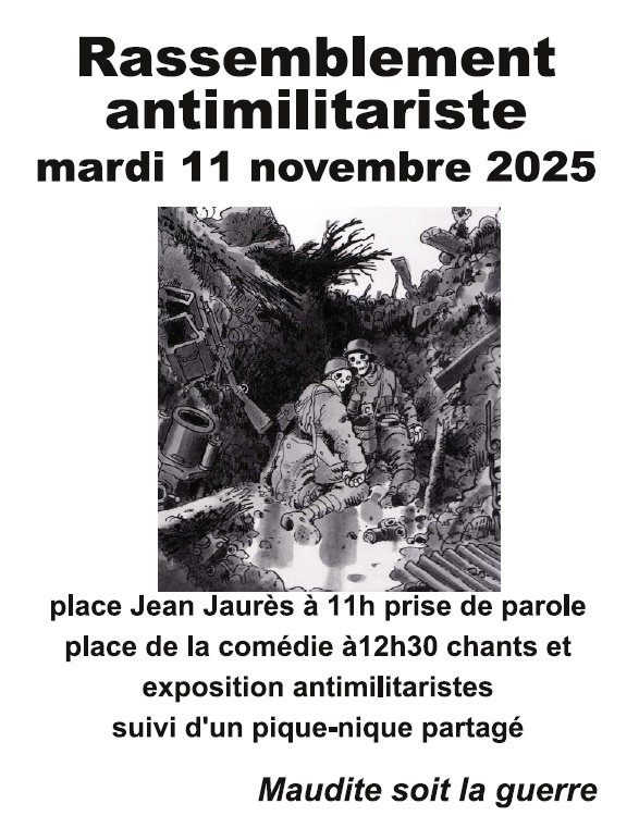 12h30 Chants et exposition antimilitariste (place de la comédie) suivi d'un pique nique partagé