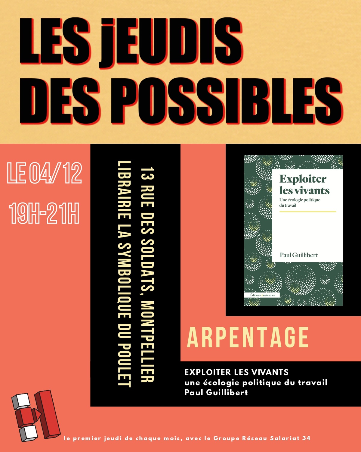 Notre prochain arpentage aura lieu le jeudi 4 décembre de 19h à 21h à la Librairie La Symbolique du Poulet (13 rue des Soldats, Montpellier). Nous lirons et échangerons autour du livre : Exploiter les vivants – Une écologie politique du travail de Paul Guillibert. L’auteur propose une synthèse originale qui replace le travail au cœur de l’écologie politique. De la plantation coloniale au foyer familial, il montre que l’écocide résulte d’un même processus : l’exploitation du vivant sous toutes ses formes. Une réflexion puissante qui relie écologie, luttes sociales et émancipation collective.
