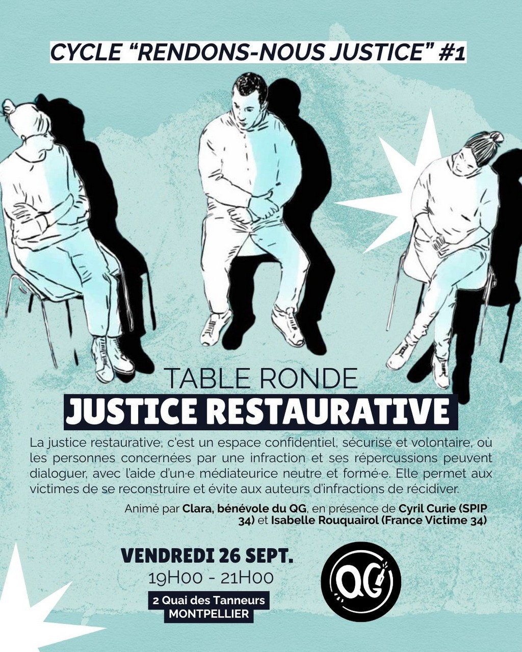 Comment se réapproprier nos conflits? Comment restaurer des liens fragilisés, continuer à faire société? Le QG propose d'explorer collectivement ses manières de faire justice, et lance un cycle d'évènements "Rendons-nous justice". Ce cycle débute sur une table ronde sur la justice restaurative, en présence de Cyril Curie (SPIP 34) et Isabelle Rouquairol (France Victime 34). La justice restaurative, c'est un espace confidentiel, sécurisé et volontaire, où les personnes concernées par une infraction et ses répercussions peuvent dialoguer, avec l’aide d’un médiateur neutre et formé. Elle peut permettre aux victimes de trouver une réparation.